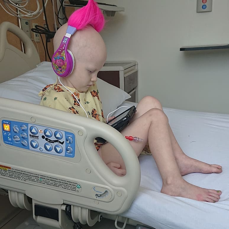 Mia was 3 years old when she was diagnosed with Stage 4 high risk neuroblastoma. She was sick for a couple months, but three weeks before diagnosis she got a pretty high fever and was diagnosed with cat scratch fever. After a week and a half on antibiotics, she wasn’t doing any better. She was put on iron for low hemoglobin. Then she stopped being able to stand or walk and all she would do was lie on the couch and cry because she was in so much pain.